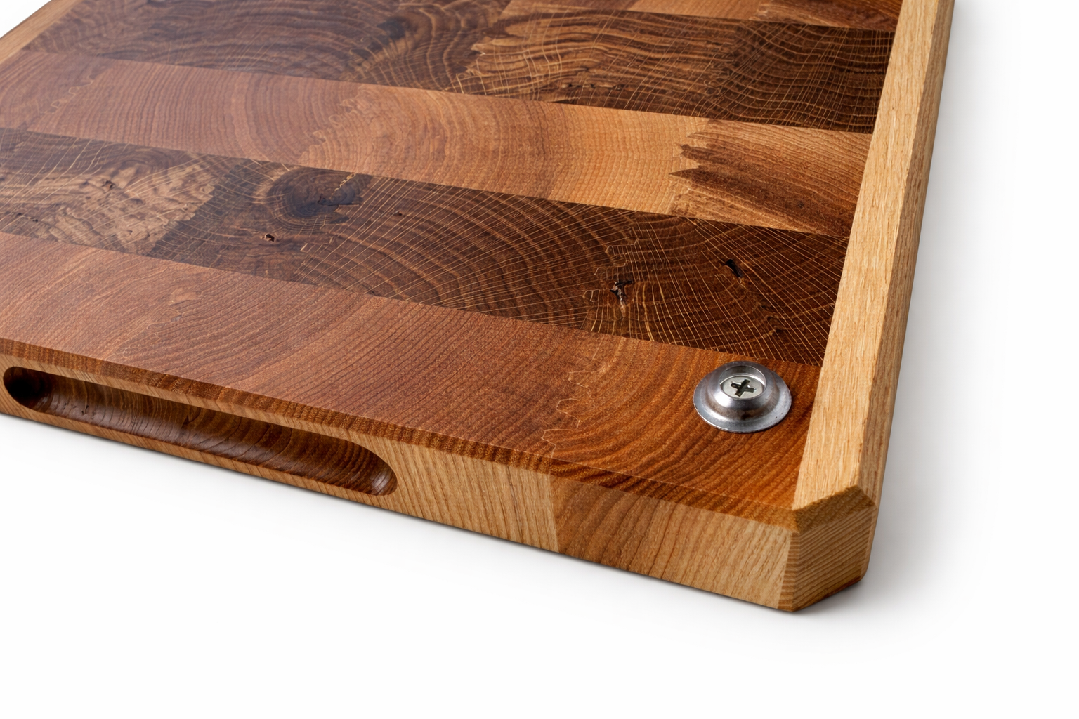 Rankų darbo iš klijuotos uosio ir ąžuolo medienos pagamintos didelės pjaustymo lentelės. Lentelės yra klijuotos iš gryno medžio detalių, kurios sujungtos specialiu raštu, suteikiančios lentelės modernaus dizaino atspalvį. Gamyboje naudoti aukštos kokybės “Kleiberit klijai. Taip pat lentelės yra impregnuojamos specialiu, žmogaus organizmui nekenksmingu, šalto spaudimo linų sėdmenų aliejumi. Produktas yra tvirtas ir patikimas bei sertifikuotas kaip tinkamas naudoti maisto gamyboje.