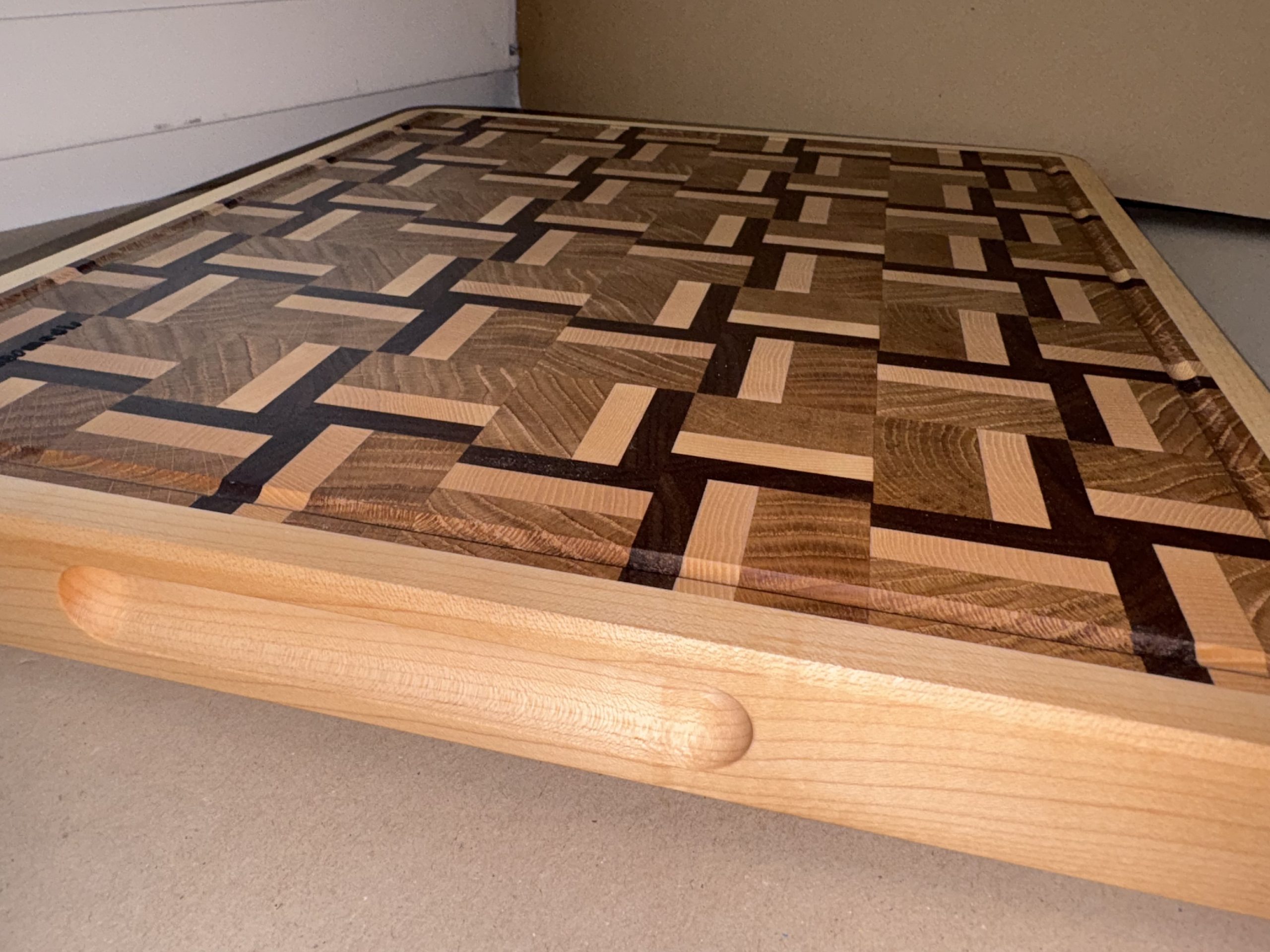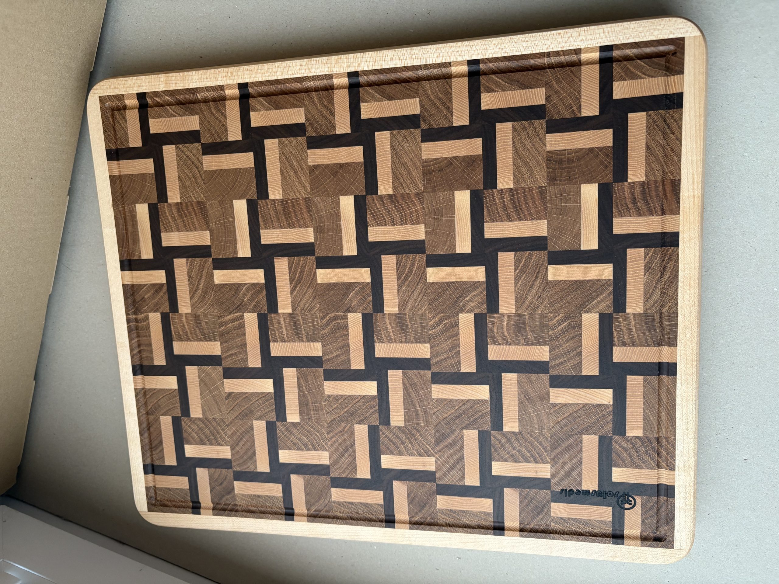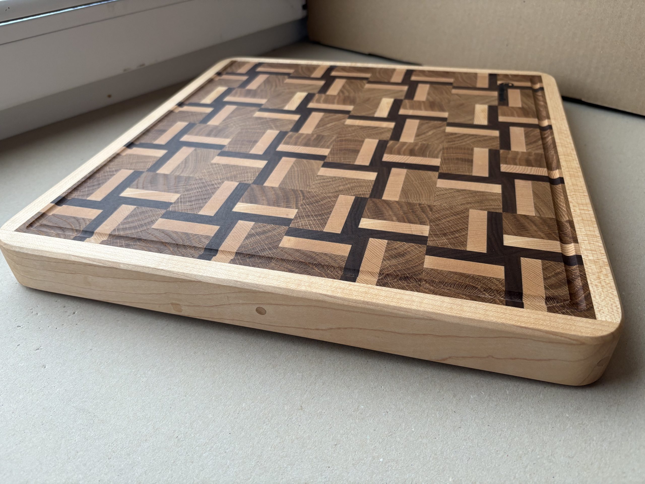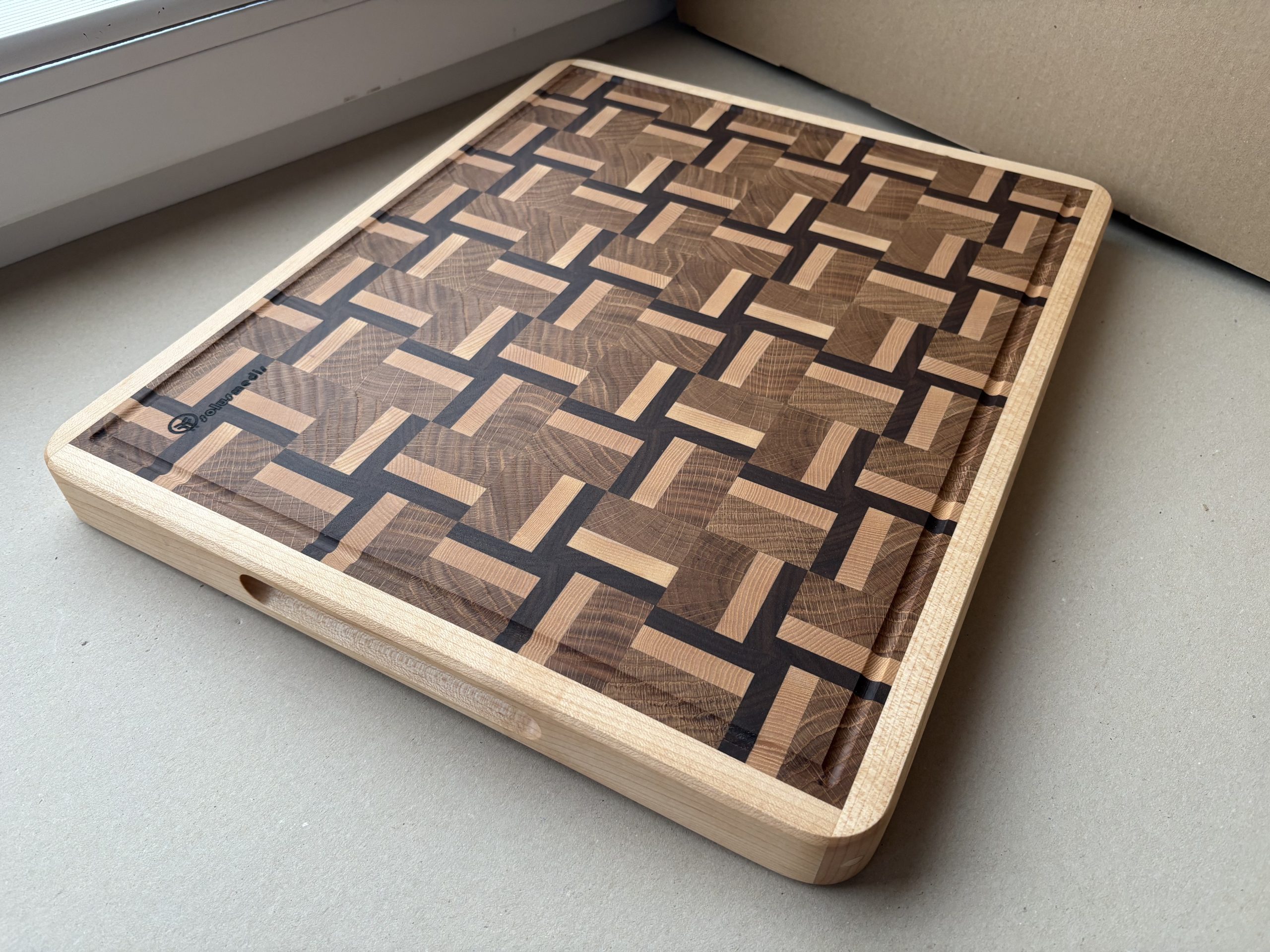 Rankų darbo iš klijuotos ąžuolo, amerikietiško klevo, vengės medienos pagamintos didelės pjaustymo lentelės. Lentelės yra suklijuotos iš gryno medžio detalių, sujungtų tarpusavyje specialiu raštu. Tai lentelės modernaus dizaino atspalvį ir patikimą konstrukciją. Atskiros detalės sujungtos specialiu raštu, suteikiančios lentelės modernaus dizaino atspalvį. Gamyboje naudotas aukštos kokybės “Kleiberit” klijai. Taip pat lentelės yra impregnuojamos specialiu, žmogaus organizmui nekenksmingu, šalto spaudimo linų sėdmenų aliejumi. Produktas yra tvirtas ir patikimas bei sertifikuotas, kaip tinkamas naudoti maisto gamyboje. Ši lentelė turi išfrezuota iš patogiai paimti į rankas
