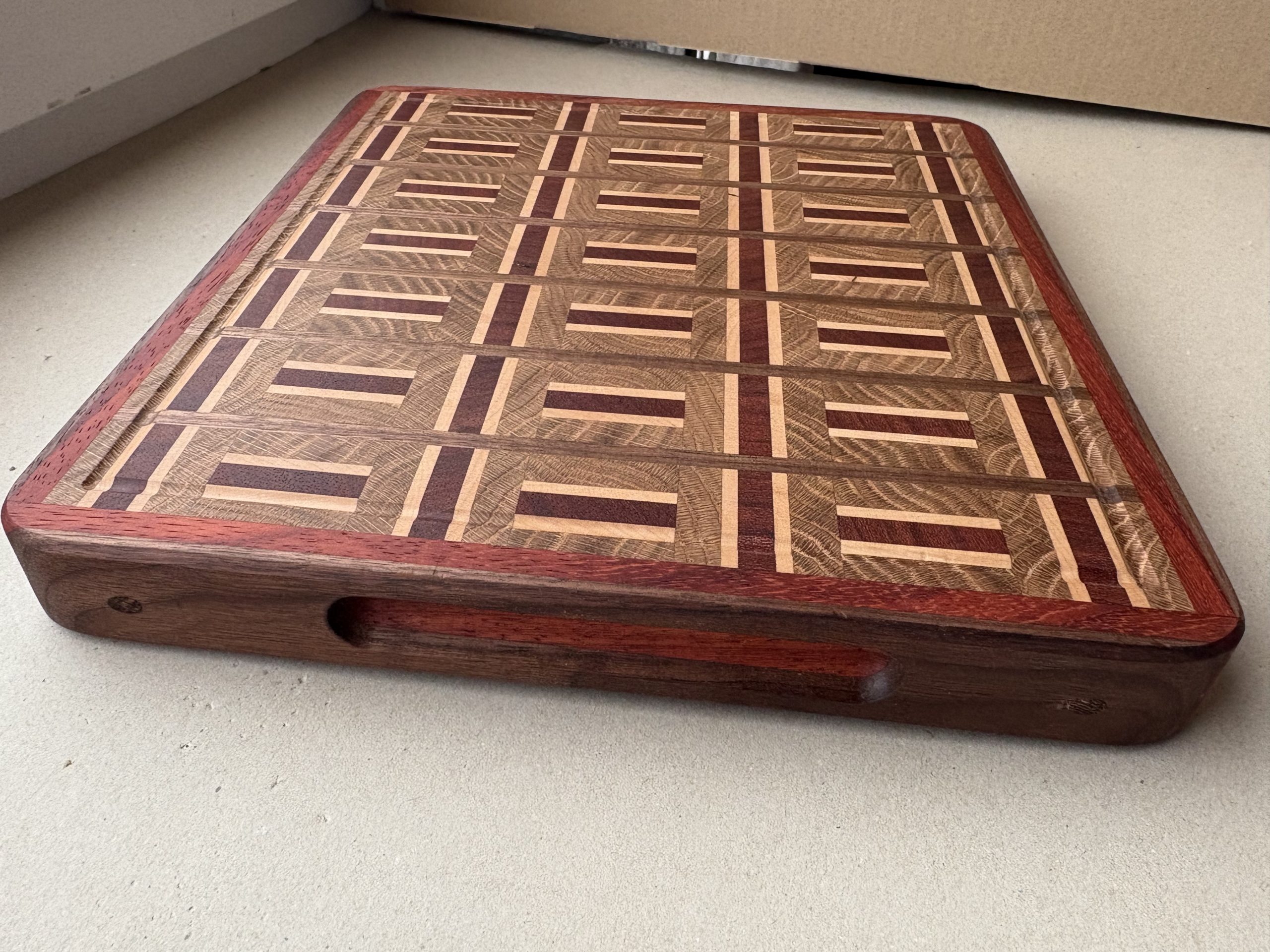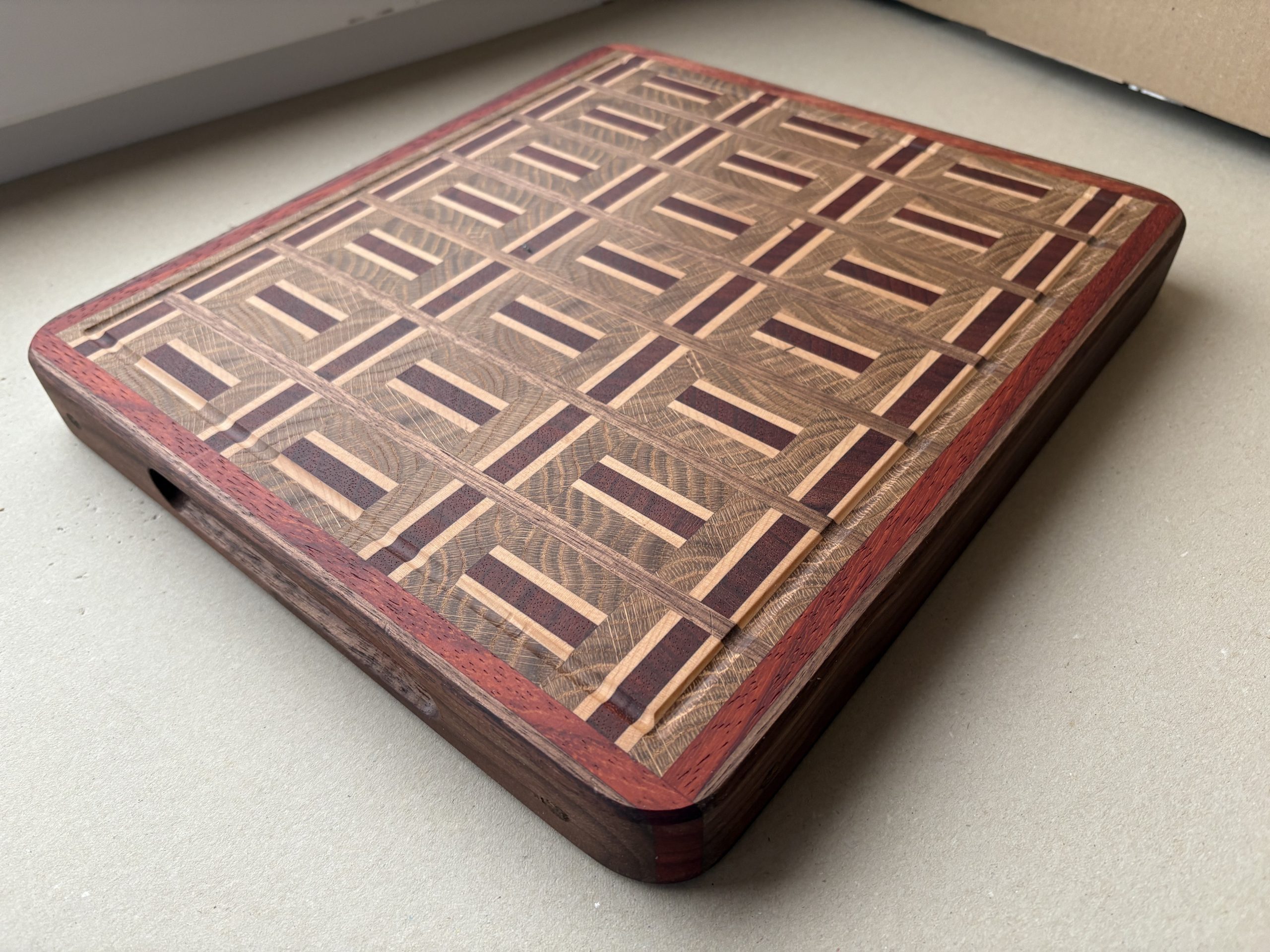Rankų darbo iš klijuotos ąžuolo, klevo, wengės, riešutmedžio medienos pagamintos didelės pjaustymo lentelės. Lentelės yra klijuotos iš gryno medžio detalių , suteikdami itin tvirtą ir patikimą lentelės konstrukciją. Atskiros detalės sujungtos specialiu raštu, suteikiančios lentelės modernaus dizaino atspalvį. Gamyboje naudotas aukštos kokybės “Kleiberit” klijai. Taip pat lentelės yra impregnuojamos specialiu, žmogaus organizmui nekenksmingu, šalto spaudimo linų sėdmenų aliejumi. Produktas yra tvirtas ir patikimas bei sertifikuotas, kaip tinkamas naudoti maisto gamyboje. Ši lentelė turi įfrezuotas išėmas patogiai paimti į rankas .