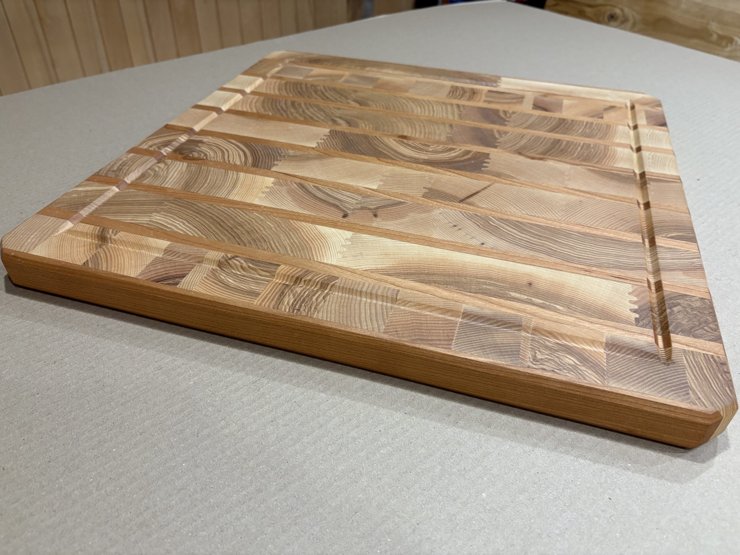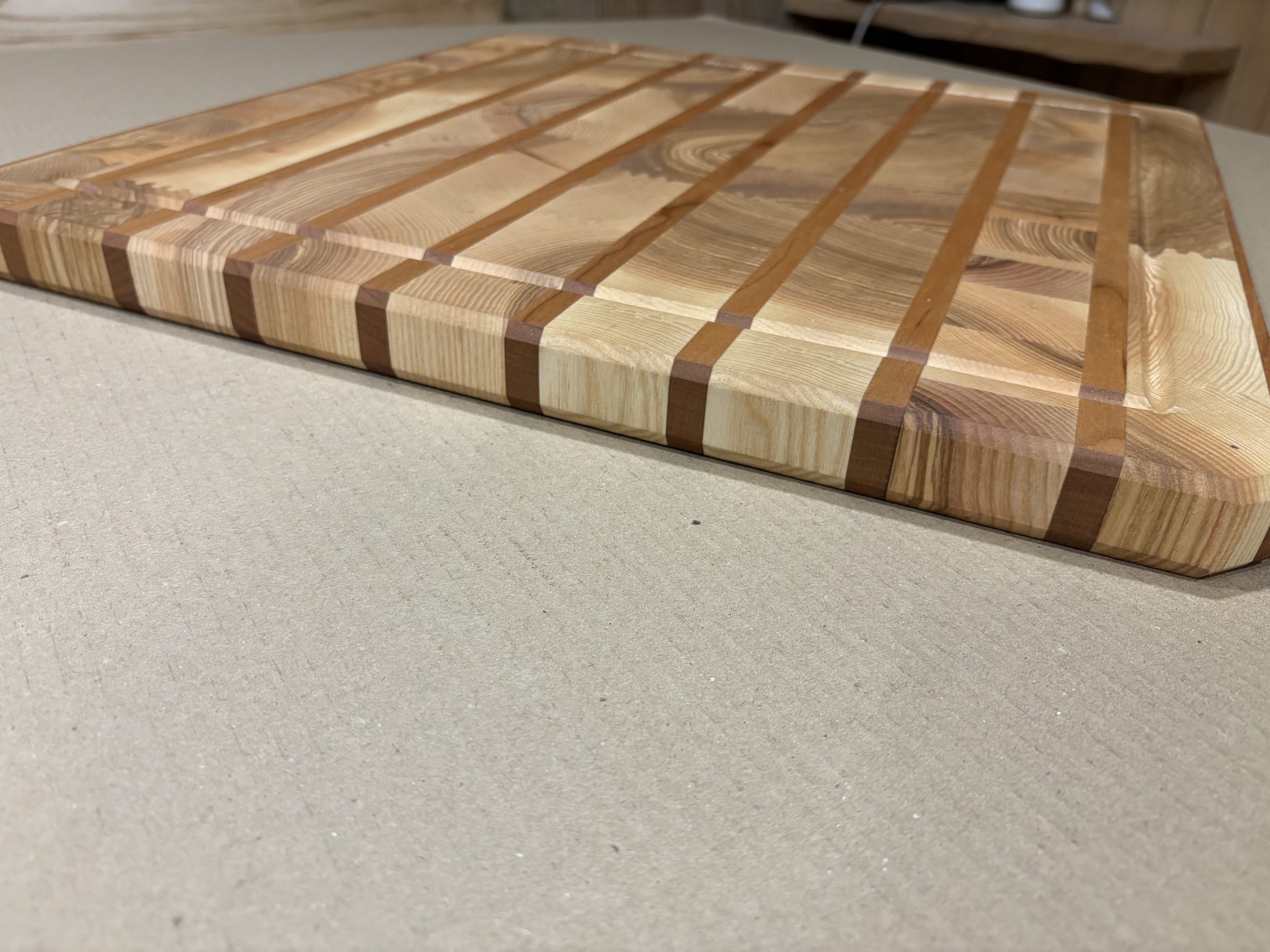 Rankų darbo iš klijuotos uosio ir ąžuolo medienos pagamintos didelės pjaustymo lentelės. Lentelės yra klijuotos iš gryno medžio detalių su viduryje išgręžtomis skylėmis, per kurias įkišti varžtai suveržia atskiras lentelės dalis, suteikdami itin tvirtą ir patikimą lentelės konstrukciją. Atskiros detalės tarpusavyje jungiamos specialiu raštu, suteikiančiu lentelėms modernaus dizaino atspalvį. Gamyboje naudotas aukštos kokybės “Kleiberit” klijai. Taip pat lentelės yra impregnuojamos specialiu, žmogaus organizmui nekenksmingu, šalto spaudimo linų sėmenų aliejumi. Produktas yra tvirtas ir patikimas bei sertifikuotas, kaip tinkamas naudoti maisto gamyboje