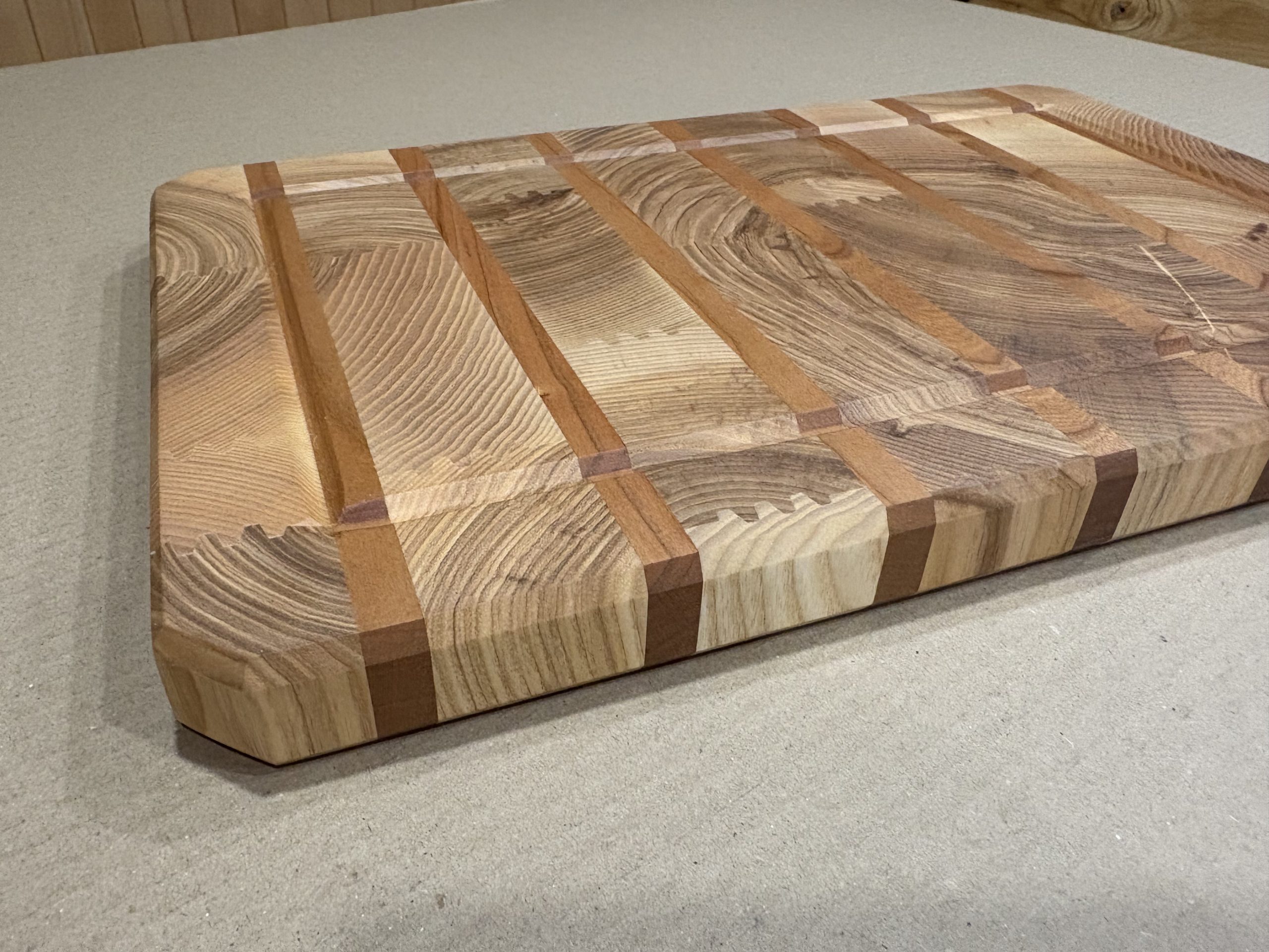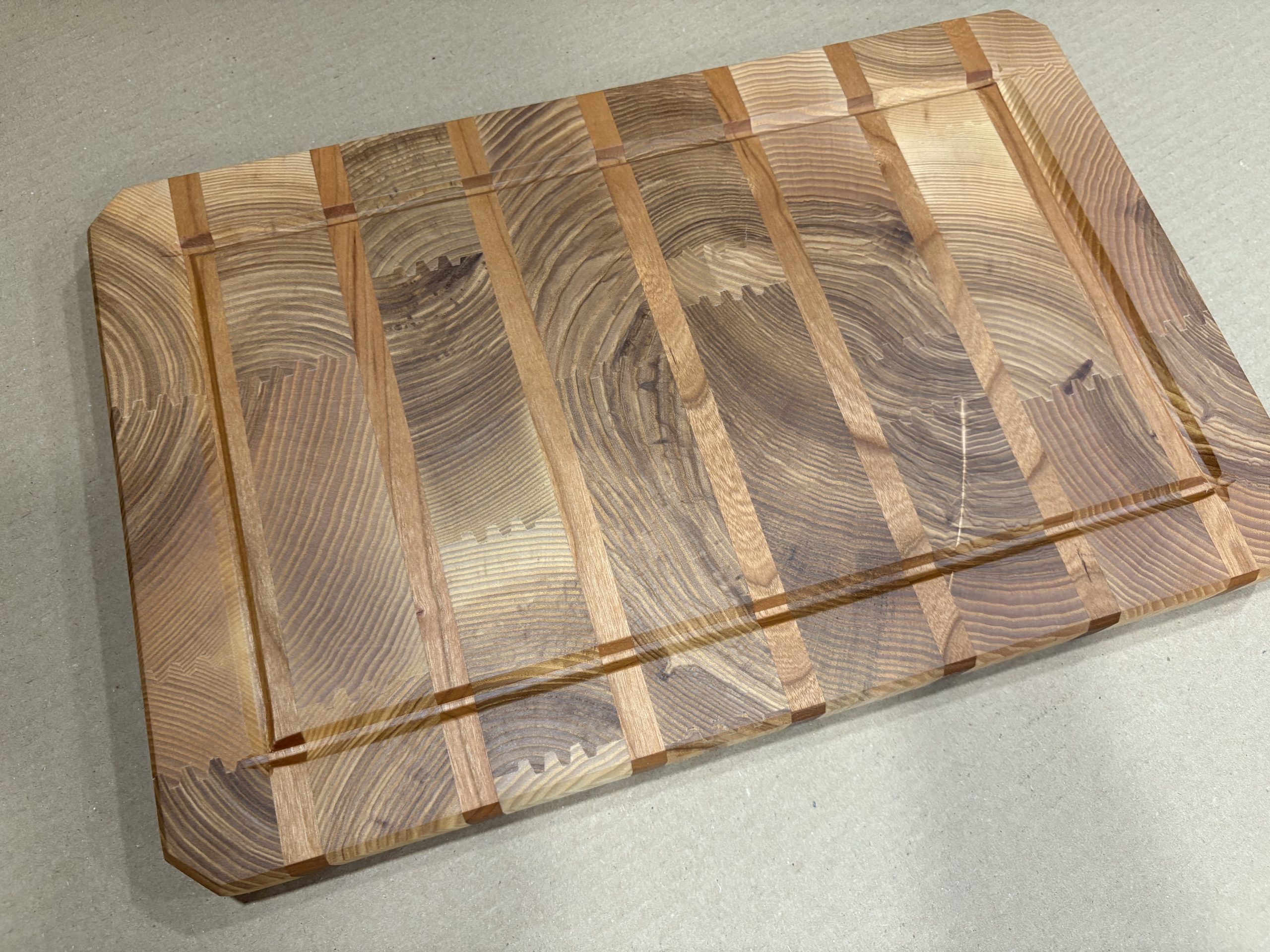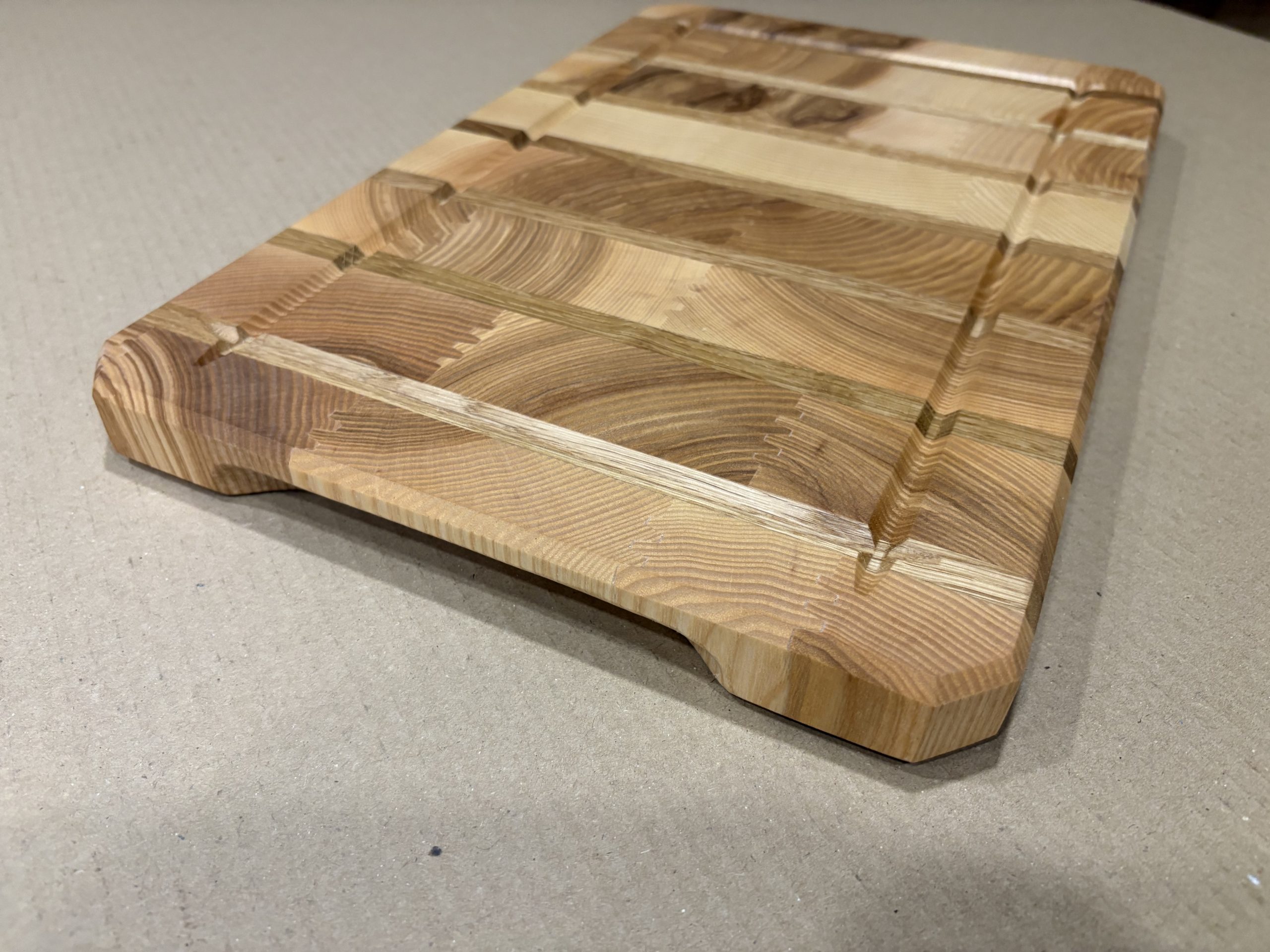 Rankų darbo iš klijuotos uosio ir ąžuolo medienos pagamintos didelės pjaustymo lentelės. Lentelės yra klijuotos iš gryno medžio detalių, kurios tarpusavyje sujungtos specialiu raštu, suteikiančios lentelės modernaus dizaino atspalvį. Gamyboje naudoti aukštos kokybės “Kleiberit” klijai. Taip pat lentelės yra impregnuojamos specialiu, žmogaus organizmui nekenksmingu, šalto spaudimo linų sėdmenų aliejumi. Produktas yra tvirtas ir patikimas bei sertifikuotas kaip tinkamas naudoti maisto gamyboje.