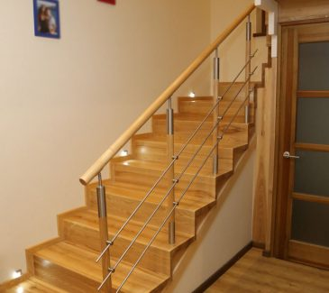 Uosiniai lakuoti laiptai ant nerūdijančio plieno konstrukcijos su porankiu, susidedančiu iš medinio porankiu, sujungto į vientisą konstrukciją, kuoliukų su nerūdijančio plieno detalėmis ir nerūdijančio plieno strypų.