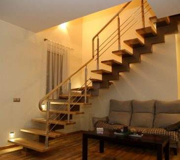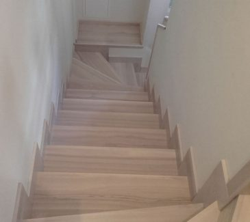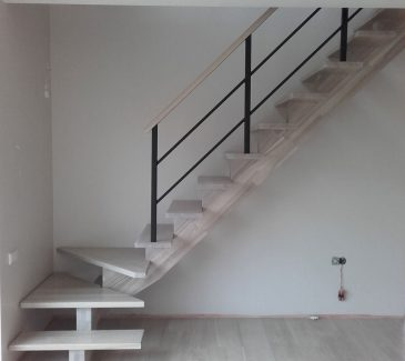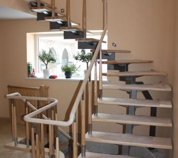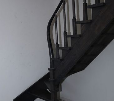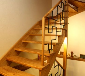 Uosiniai lakuoti laiptai ant juodai dažytos nerūdijančio plieno konstrukcijos. Kuoliukų vientisu porankiu, kurio užsukimai priderinti medžio dirbinį klijuojant, apdirbant medžio kaltais bei šveitimu vietoje.