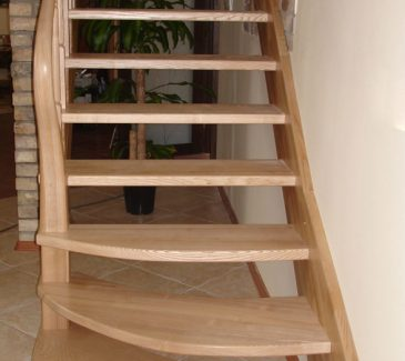 Sukti uosiniai lakuoti laiptai ant dviejų medinių laiptasijų. Laiptai sukasi aplink pagrindinę koloną.