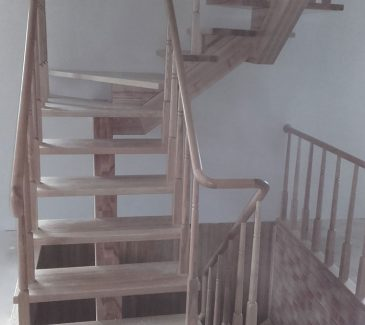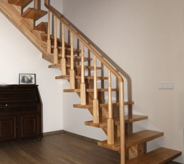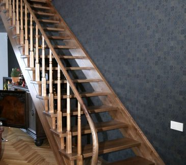 Uosiniai lakuoti laiptai per du aukštus ant vienos medinės laiptasijos. Mediniai kuoliukai sujungti su vientisu porankiu.