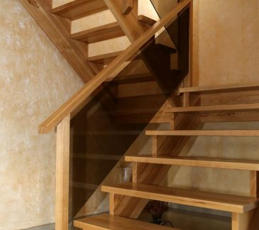 Uosiniai lakuoti laiptai ant dviejų medinių laiptasijų. Porankis sudarytas iš medinės dalies ir tamsinto stiklo.