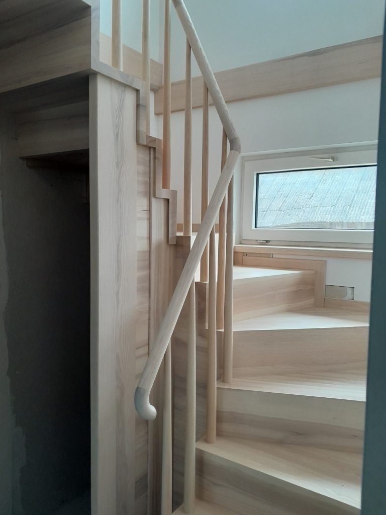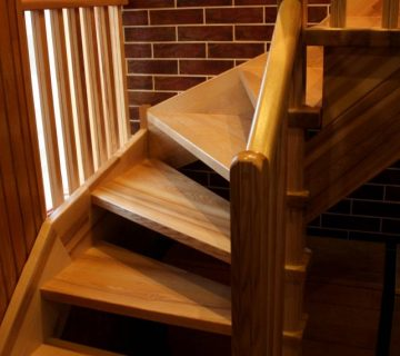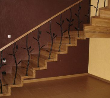 Uosiniai lakuoti laiptai ant juodai dažytos nerūdijančio plieno konstrukcijos. Kuoliukų vientisu porankiu, kurio užsukimai priderinti medžio dirbinį klijuojant, apdirbant medžio kaltais bei šveitimu vietoje.
