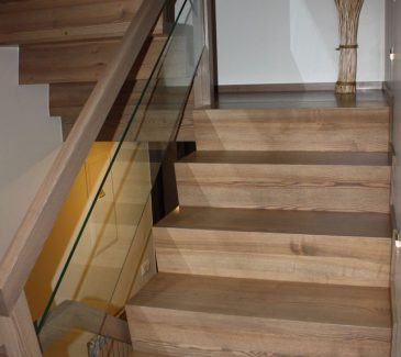 Uosiniai lakuoti laiptai ant dviejų medinių laiptasijų. Porankis sudarytas iš medinės dalies ir tamsinto stiklo.