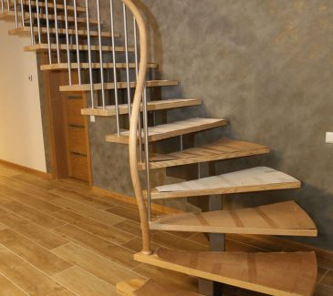 Sukti uosiniai lakuoti laiptai ant dviejų medinių laiptasijų. Laiptai sukasi aplink pagrindinę koloną.