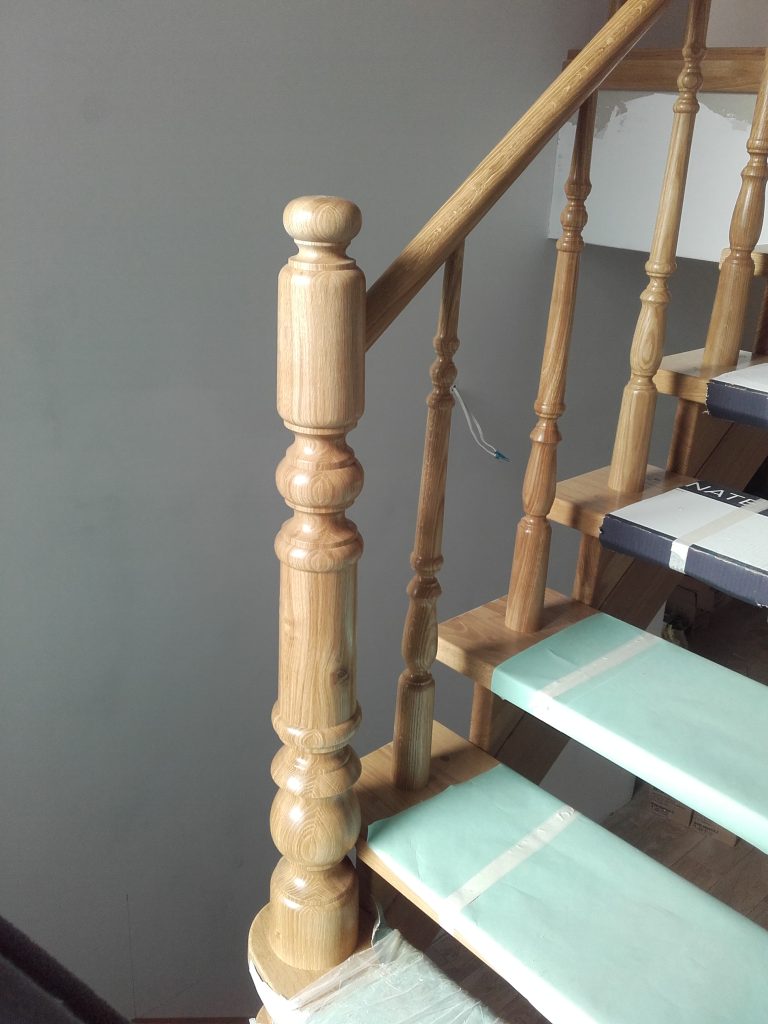 Uosiniai lakuoti laiptai per du aukštus ant vienos medinės laiptasijos. Mediniai kuoliukai sujungti su vientisu porankiu.